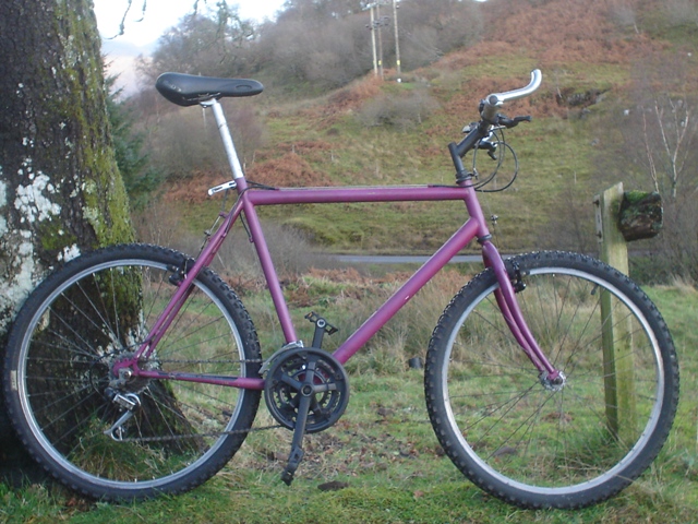 No Logo purple mountain bike, used, in good condition. This ones lost it's identity but remains a capable all-round mountain bike more than happy as an anonymous commuter, student bike or taking on off-road trails. Serviced in full working order. 21" steel frame in purple 26" wheels suit inside leg 33" - 36" Shimano SIS 18 speed with thumbshifters Cantilever brakes front and rear. Velo comfort suspension gel saddle. (New) 26" alloy rims 1.95" tyres with good tread. Alloy bar ends Bike is fully serviced and shipped fully assembled. Pedals will be reversed and handlebars turned to side. Sold £70 |