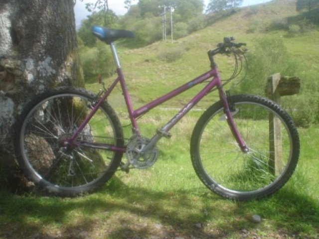 Straightforward general purpose mountain bike. Ideal for commuting or tackling tracks and trails at the weekend. Serviced in full working order. 20" steel frame in purple 26" wheels suit inside leg 27" - 33" Shimano SIS 15 speed with thumb shifters. V- brakes front and rear Brand new anatomic saddle. 26" alloy wheels 1.95" tyres with offroad tread in good condition. |