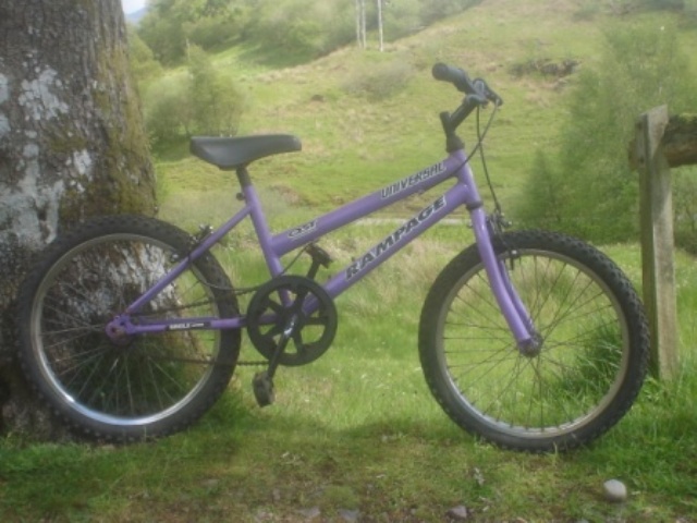 Ready for rough and tumble. Single speed so no derailleurs to bend or go wrong. simple functional bike. Serviced in full working order. 12" steel frame in purple 20" wheels suit inside leg 21-23" Single speed Caliper brakes front and rear 20" wheels 1.95" tyres with light offroad tread in good condition. Sold £17.01 |